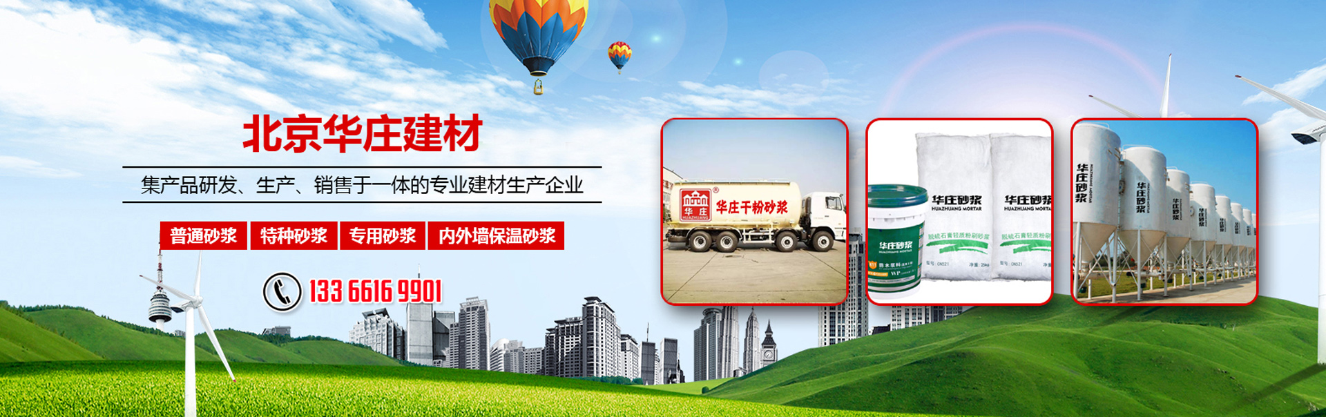 北京華莊建材有限責(zé)任公司主營(yíng)干混砂漿、專(zhuān)用砂漿、內(nèi)外墻保溫砂漿、特種砂漿等4個(gè)系列30多種產(chǎn)品,歡迎您的咨詢(xún)!13366169901 01081288690        北京華莊建材有限責(zé)任公司主營(yíng)干混砂漿、專(zhuān)用砂漿、內(nèi)外墻保溫砂漿、特種砂漿等4個(gè)系列30多種產(chǎn)品,歡迎您的咨詢(xún)!13366169901 01081288690